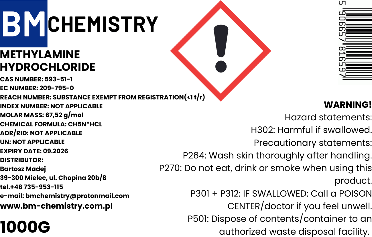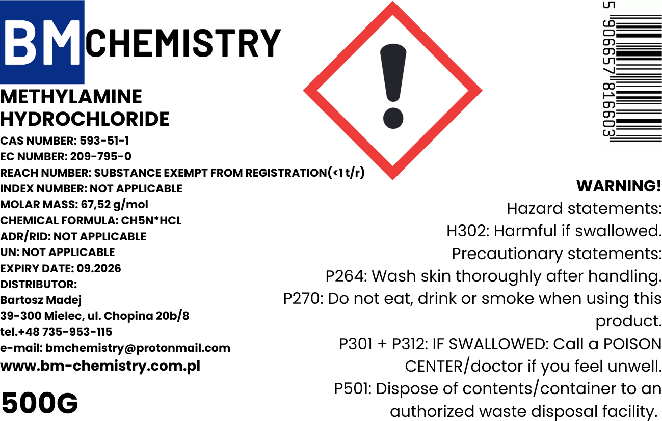 Methylamine hydrochloride is a high quality organic salt with the molecular formula CH6ClN and CAS number 593-51-1 It is a white crystalline solid highly soluble in water and ethanol widely used as an intermediate in chemical pharmaceutical and agrochemical synthesis